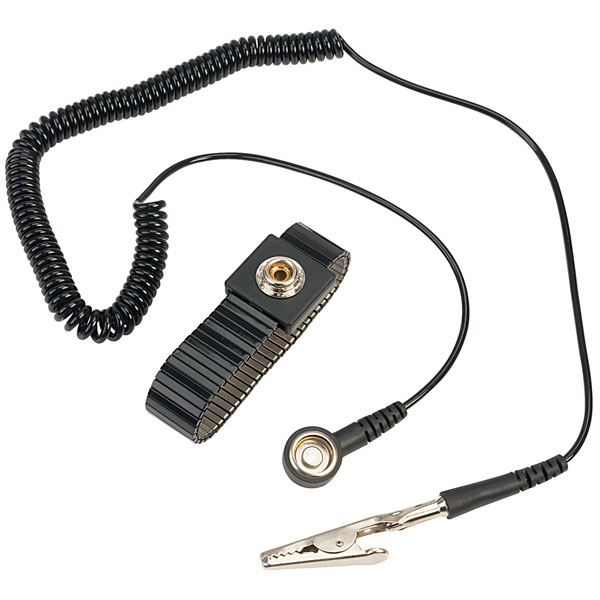 An expandable stainless steel wristband with standard 10mm contact press stud for connection to a grounding cord.