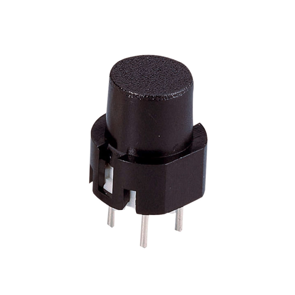 Black pulse switch suitable for use in all areas of IC technology, microcomputer technology, remote control, measurement and control units and electronic games. Their small dimensions allow these buttons to be used in keypads with a minimum spacing of 12.7 mm. The tight-fitting knobs may be used for direct front-panel mounting.