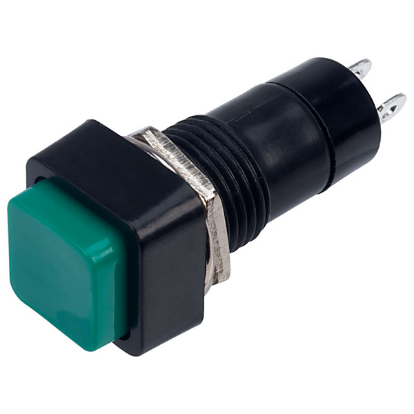 Value-for-money panel-mounted latching push button switch with square green actuator.