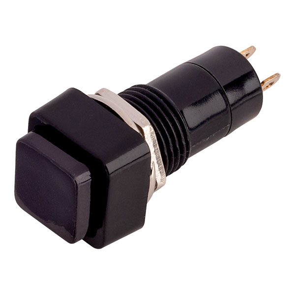Value-for-money panel-mounted push button switch with a black coloured button.