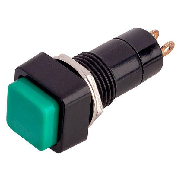 Value-for-money panel-mounted push button switch with a green coloured button.
